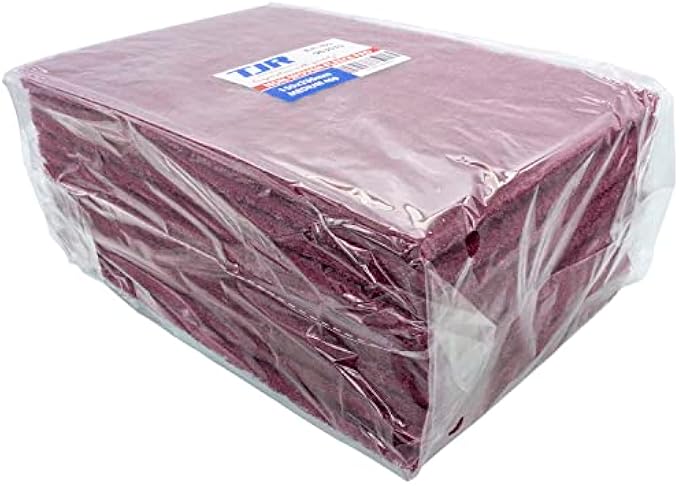Box of 10 TJR Non-Woven fleece pads 6"x9" red Medium P400 grit for General Purpose. High-performance red fine scuffing pads that deliver a medium aluminum oxide abrasive cut comparable to about a P400 grit sandpaper cut.