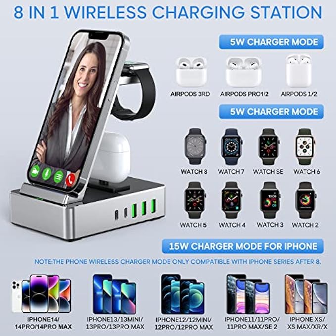 【Input Fast Charging&Power Per Port 】: 15W Phone Wireless charging station for Phones with wireless function.(Support for hybrid charging between Apple and Android.) 5W Wireless charging compatible with Apple watch8/Ultra/7/6/5/4/3/2/1/SE/SE2022, 5W charging for Air pods, 20W * 2 USB C charging and 15W *3 USB A chargers. Charging station for multiple devices plus 3 in 1 wireless charging station equal 8 in 1 wireless charging station.