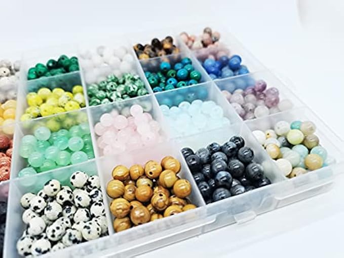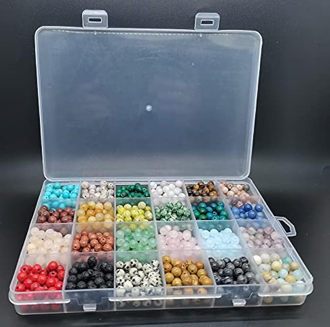 24 Gemstones: Blue Turquoise, Granite, Created Malachite, White Crazy Onyx, Tiger Eye, Plum Blossom, Sami Red Stone, Yellow Jade, Grass Turmeric, Green Point, Created Malachite, Blue Aventurine, Pink Aventurine, opal, purple mica, red volcanic rock, speckled stone, wood Jasper, Labr. garnet, amazonite