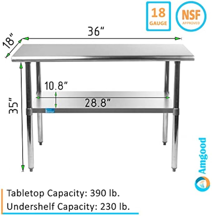 "This heavy-duty industrial quality multi-purpose stainless steel utility table is a great fit for a variety of commercial and residential applications such as commercial kitchens, garages, labs, laundry room, etc The tabletop is made with 18 gauge 430 stainless steel The bottom shelf and the legs are made with galvanized steel. Adjustable bullet feet allow to improve stability on uneven floors and prevent the floor from being scratched.