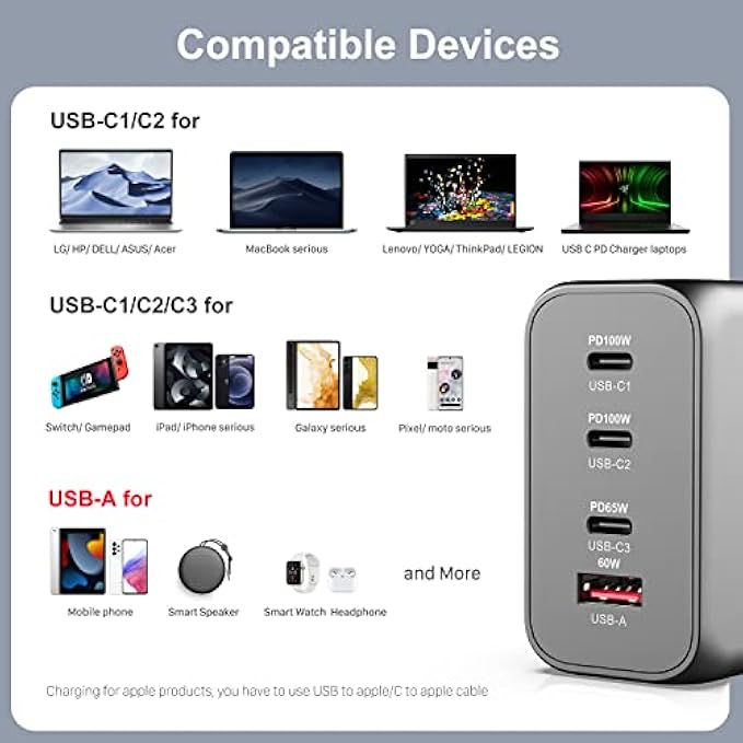 [Better than 130W Charger Block] When using C1 and C2 together, this USB A and C charger cube provides 100W+100W fast charging power for two laptops at the same time. When using all c ports together(C1+C2+C3), this USB C charger hub provides 100W+65W+30W fast charging power for one 100W laptop, one 65W laptop and one cell phone.