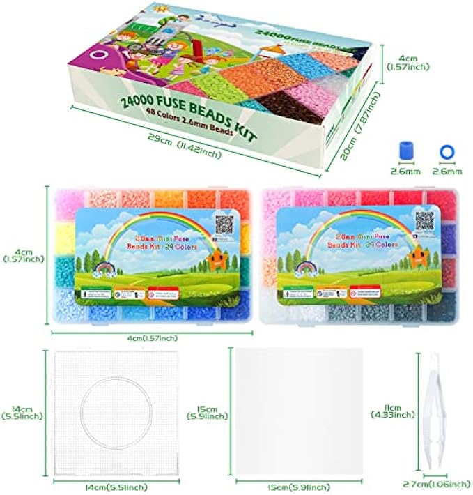 VALUE PACK - Includes 24000 mini fuse beads (2.6mm) in 48 bright colors, packed in two boxes, 2 tweezers, 2 peg boards, 2 iron-on sheets.