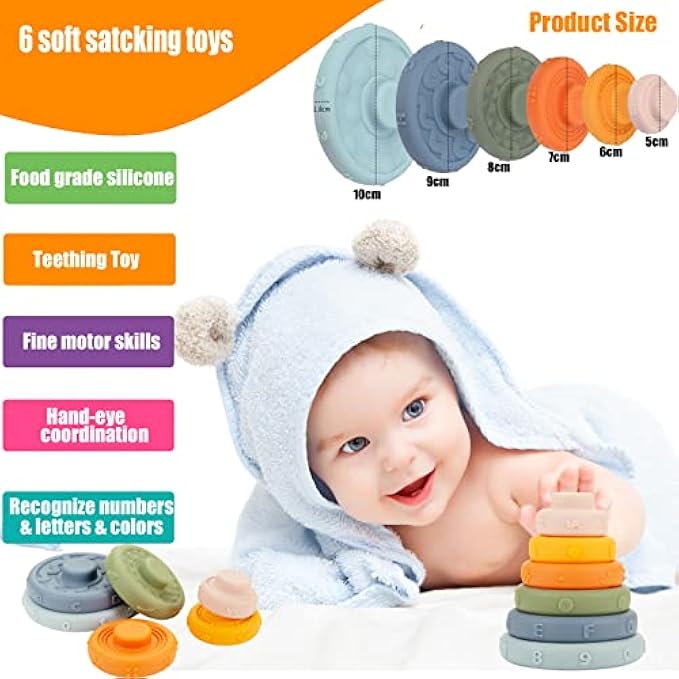 ✅【3 IN 1 Baby Sensory Toys】Our 6 month old baby toys include 1 UFO silicone pull string activity toy, 6 soft stacking rings in different colors and 5 baby sensory balls with textures. Designed for toddlers. The perfect gift for toddlers 18 months older.