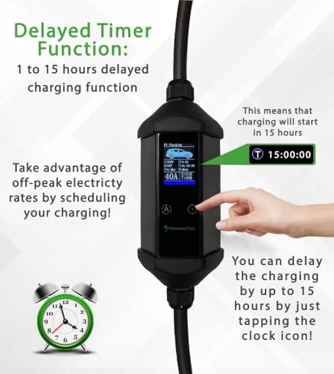 ⌚DELAY TIMER: Up to 9 Hours (in 1 Hour increments). It has also a time of the charge (count down timer function) to take advantage of discount electric company rates.? INTELLIGENT CHIP — Intelligent chip automatically provides the requested amperage from your EV. ☔️ Primecom Smart chargers are waterproof and are safe to use outdoors. ? UNIVERSAL COMPATIBILITY! Works with all brand EV Cars.