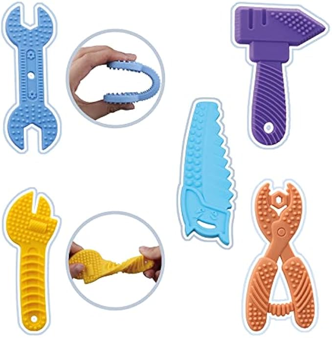 Sensory Toys Exterior: Our baby teether is smartly designed in 5 different tool shapes and different colors, there are also have various shape bumps on the surface of the toy to stimulate the baby's tactile and visual senses.