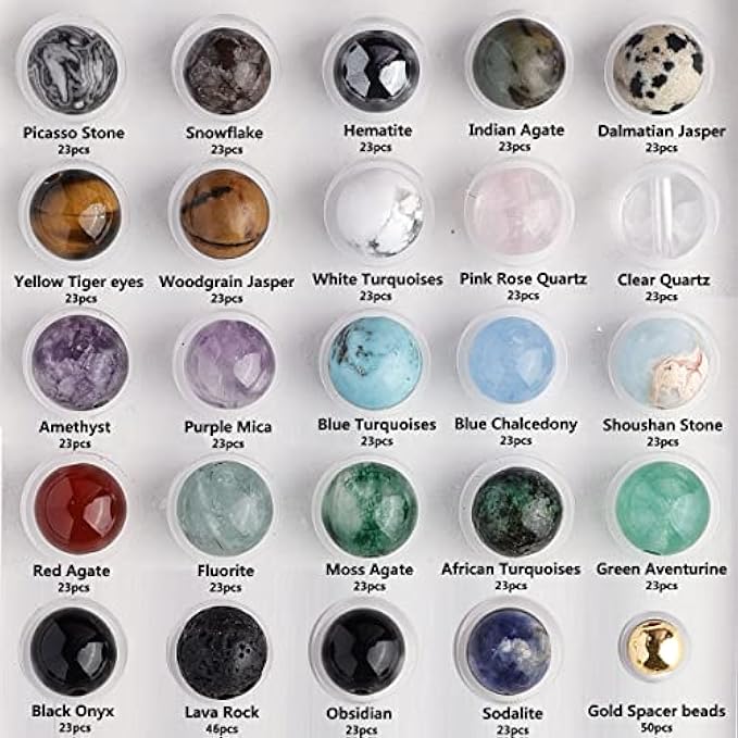 25 Material Gemstone Beads: Onyx, Black Onyx, Hematite, Green Aventurine, Moss Onyx, Blue Turquoise, White Turquoise, African Turquoise, Pink Rose Quartz, Clear Quartz, Amethyst, Spotted, Indian Onyx, Yellow tiger's eye, snowflake, cape stone, obsidian, tile rock purple mica, picasso stone, blue chalcedony onyx, fluorite, soda stone, wood grain jasper, gold spacer beads.