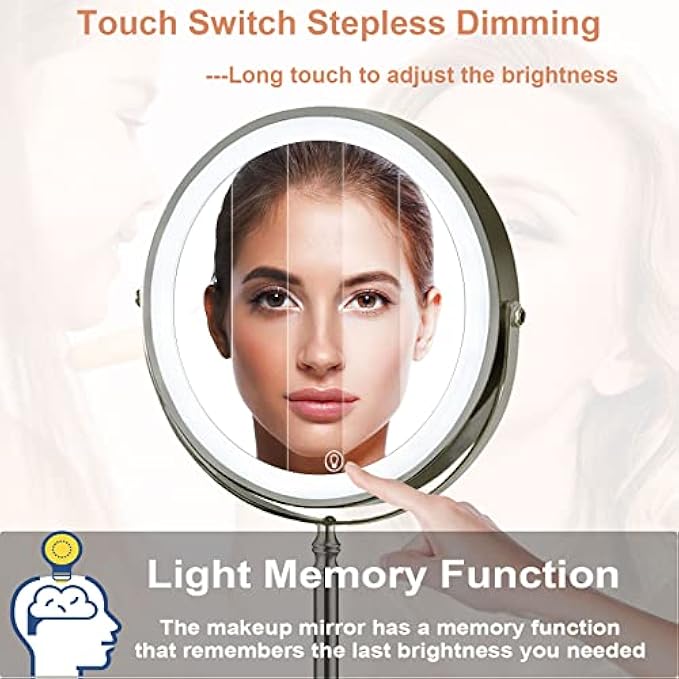 ❤【Light Memory Function & Stepless Dimming】:The lighted makeup mirror has a memory function, which can remember the brightness you needed the last time you used it, no need to adjust the brightness again. ☛ Short press the touch sensor to change the light color, long press to adjust the brightness