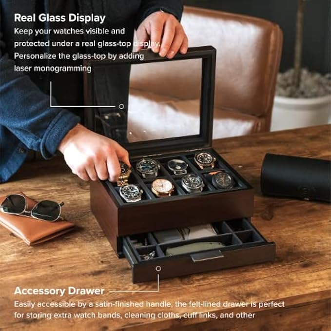SUPERIOR CRAFTSMANSHIP - From the beautiful walnut wood exterior, large real glass-top display, solid metal hardware, included apple watch stand, and accessory storage, this watch box cuts no corners, delivering the most complete watch setup.