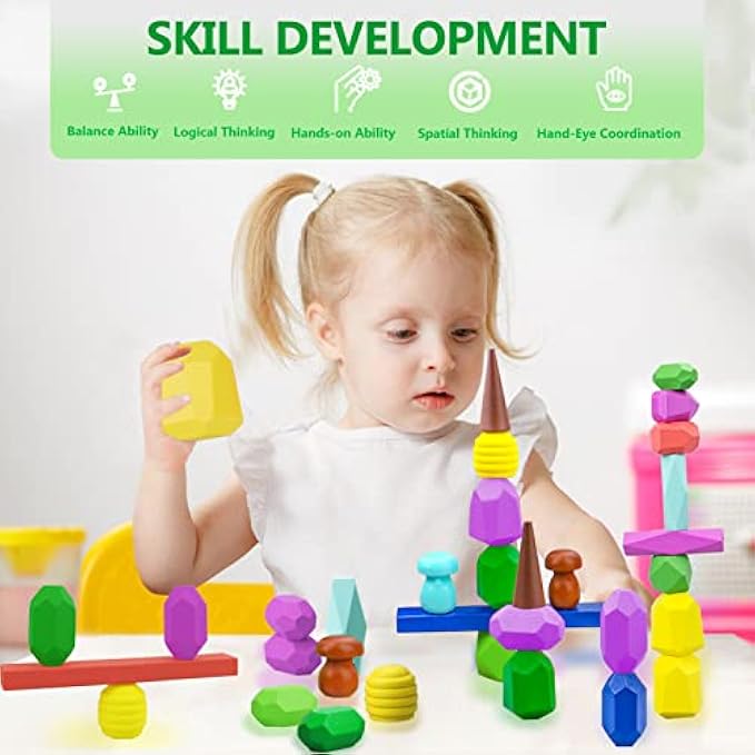 【PREMIUM SAFE MATERIAL】The balancing stones are made of high quality wood coated with water-based paint, which is environmentally friendly and non-toxic. Each section of these Montessori toys is a smooth surface with no burrs to prevent injuries to toddlers and ensure their safety.