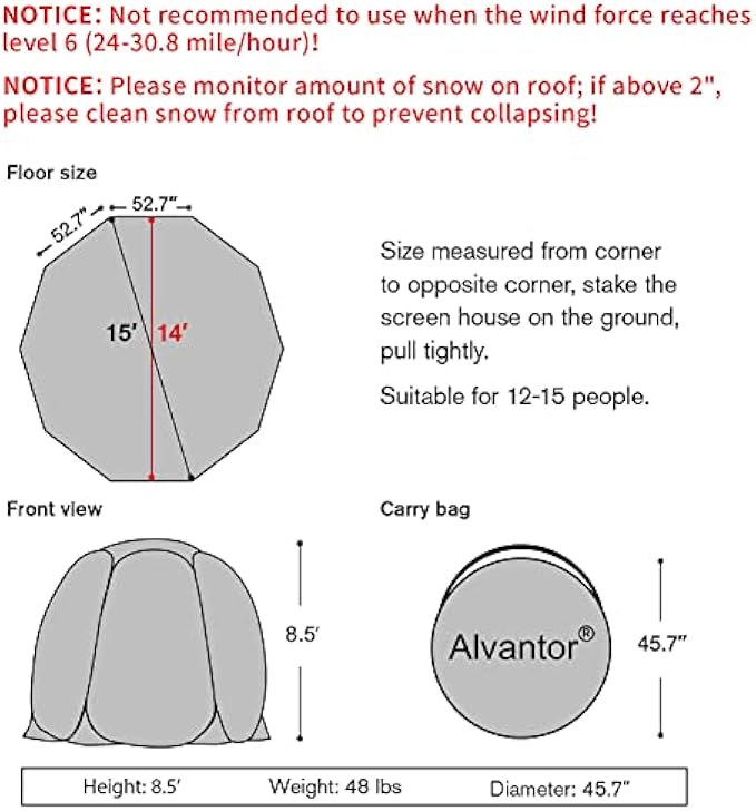 PATENT PROTECTED ALVANTOR DESIGN: This winter screen house measures at (Width: 15’, Depth: 15’, Height: 8.5’) and comes with a compact carry bag. Weighing just 48 lbs, this pop up igloo tent has an innovative folding technique making it easy to fold down and store back in the carry bag. Ready to go in minutes!