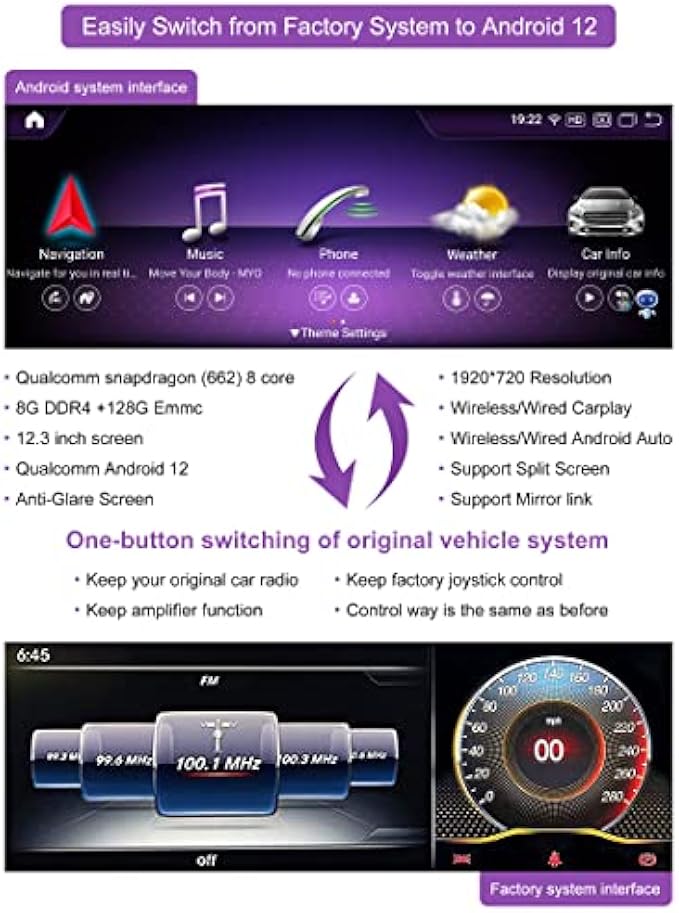 【Supports original functions】: The upgrade Android 12 screen retains all original functions, such as original car radio, amplifier function, factory joystick control, original reversing camera and reversing etc. No software changes are made on the vehicle control units.