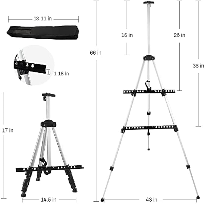 [Art Easel Stand Height Adjustable] The easel can be adjusted from 17 inches to 66 inches in height, perfect for floor easel or tabletop easel display, the art easel is only 21 inches when folded 53.3 cm) for easy storage and transport, the easel is easy to turn with knobs for quick height and angle adjustments.