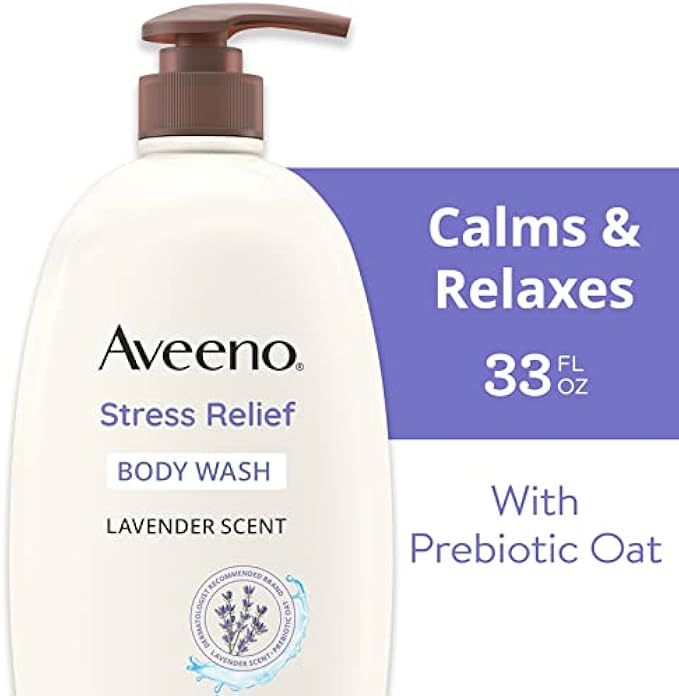 33-fluid ounces of Aveeno Stress Relief Body Wash with oat and calming lavender scent gently cleanses while removing dirt, oil and bacteria. It is clinically shown to help calm & relax you in the shower