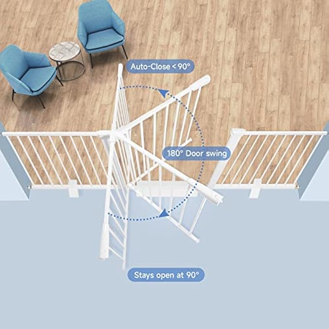 【180-degree door opening with two directions】This BABY GATE, designed for convenience and thoughtfulness to avoid frequently open and close, is kept open when the opening is 90 degrees and automatically bounces back and is locked when the opening is less than 90 degrees. Adult can open it with one hand in a second. In contrary, baby less than 3 years old and puppy can not open it.