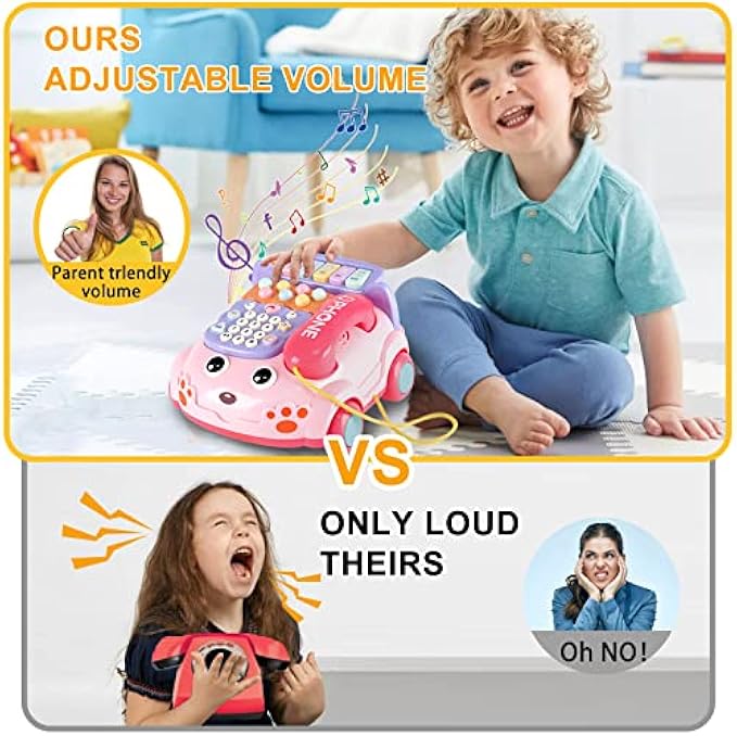 ☎【A combination of phone music toys】: kids cell phone girl analog phone toys with integrated lights and sounds. Baby phone toy has 31 buttons, including musical instruments, music, lullabies, numbers, piano, and games, which can increase children's interest in music and enhance the hand-eye coordination of young children, children can easily drag the baby toy phone cartoon machine to anywhere by dragging the tow rope.