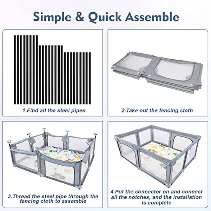 【Quick Assembling】The baby playpen is connected with anti-rust alloy pipes and ABS plastic, which is easy to disassemble and assemble. It can be done in seconds(no tools needed). The external double zipper design effectively prevents the baby from climbing out on his own and the bottom adopts waterproof fabric, easy to clean. Follow our instructions for installation or a video installation tutorial, you can easily assemble and remove the baby playpen in a short time.