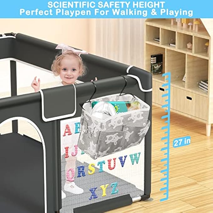 【Large area + accessories】The size of the playpen is 71 inches x 51 inches x 27 inches, which provides a lot of play space for children and their friends. Parents can also put toys in the fence and empty the room full of toys. In addition, we added a game mat and a hanging diaper box. Don't waste time and money choosing mats. Includes 4 pull tabs and 30 ocean ball, 1 Net Basket, to let your child have fun while learning how to stand