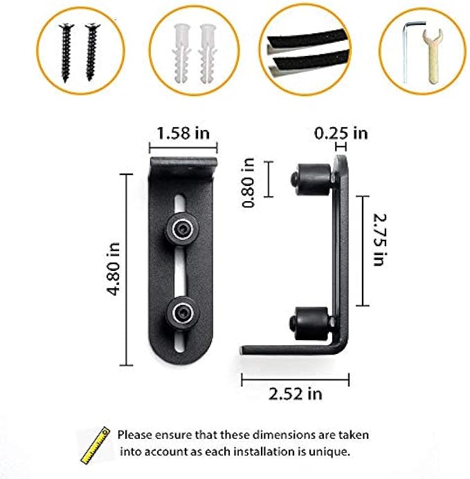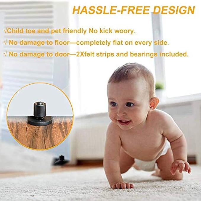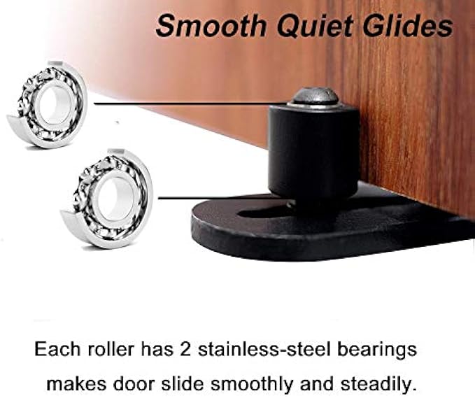 ►ALL WHEELS EQUIP WITH 2 BALL BEARINGS -Bearings provides a very quite and smooth glide as the door opens and closes,be aware of other no bearing barn door stoppers with poor functionality which may hurt your door.Dual rollers adjustable to fit to a thinner doorboard