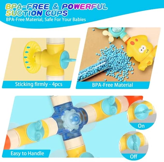 ★Safe Bathtub Toys With Powerful Suction Cups: The bathtub toys for kids are made of BPA-free durable materials. The round edges design protect children from getting hurt. There are 4 powerful suction cups, easy to stick to bathtubs and smooth wall in bathroom firmly. This bath toys for toddlers age 3-5 is safe for your kids.