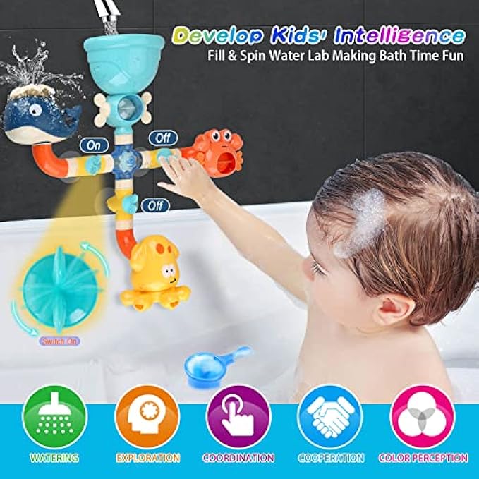 ★Bath Toys Make Bath Time Fun: The bath toys for toddlers is cute, colorful and create funny water effect. The spinning wheels, rotating octopus claws, spraying water, waterfall, revolving water flowing, toddlers at age 2 3 4 5 can play this bathtub toy by themselves, making bath time more fun!