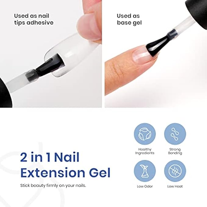 2 In 1 Base Gel & Nail Gel:This Multi-functional Nail Gel is not only for nail tips adhesive, but also can be used as Base Gel! Let it do the magic with you! 9 Toxin Free Ingredient makes it healthy and low odor. No harsh ingredients or adhesives that lead to damaged nailsan be used as Base Gel! Let it do the magic with you! 9 Toxin Free Ingredient makes it healthy and low odor. No harsh ingredients or adhesives that lead to damaged nails