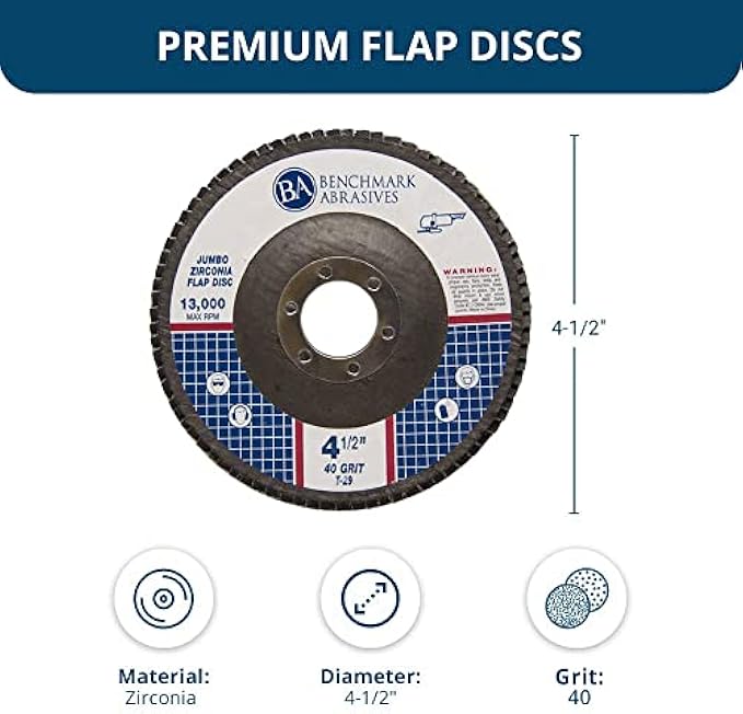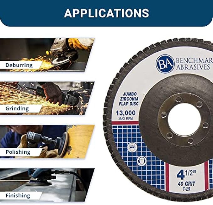 Benchmark Abrasives 4.5" x 7/8" T29 flap disc is ideal for sanding, grinding, deburring, finishing, etc. for cast Iron, steel, stainless steel, titanium, fiberglass, wood, and more.