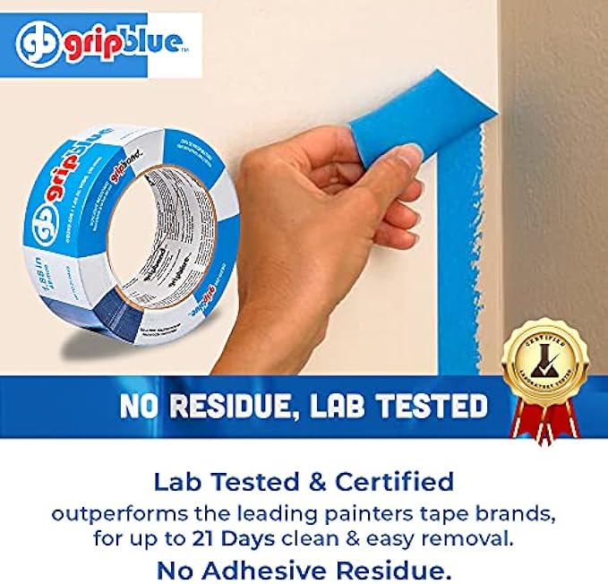 RESIDUE-FREE & LAB TESTED: GRIPBLUE painters tape is lab tested and certified to outlast leading brands of painters tape for 14 days+ cleaning, easy to remove, and leaves no adhesive behind. Medium adhesion provides good stick and is easy to remove from a variety of common household surfaces including painted walls, trim, glass, wood and metal.