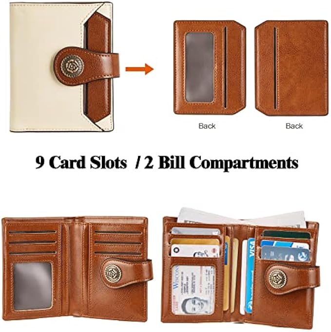 Versatile: These women's wallets offers 9 card slots, 1 ID window, 2 bill compartments, 1 coin back zipper pocket and 1 removable card sleeve. Has change part and bill fold area, holds enough credit cards, etc.