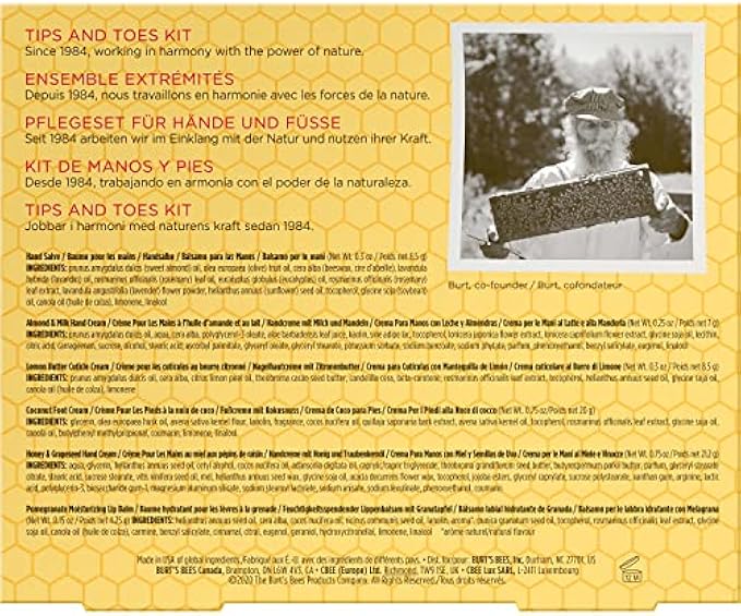 SKIN CARE PRODUCTS: Pamper from head to toe with our giftable set including 6 travel size Burt's Bees favorites: Honey & Grapeseed Oil Hand Cream, Coconut Foot Cream, Lemon Butter Cuticle Cream, Almond & Milk Hand Cream, Hand Salve & Pomegranate Lip Balm.