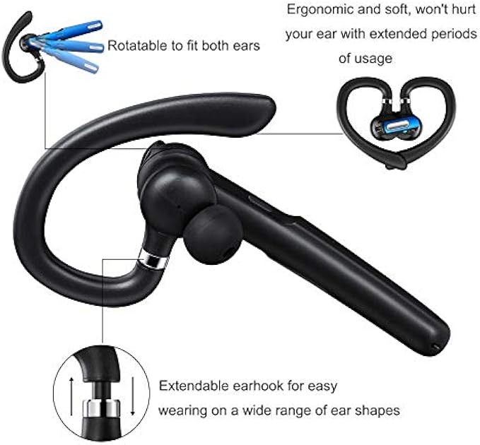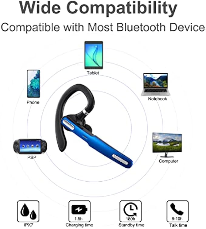 Bluetooth 5.0 technology - Provides fast and stable pairing with any device that has Bluetooth function like smart phones, tablets, laptops. It can pair easily with any two Bluetooth devices simultaneously. With up to 8-10 hours of continuous calls and up to 7. 5 days in standby mode, This Bluetooth earpiece lets you make reliable wireless calls throughout the day on a single 1. 5 hours quick charge.