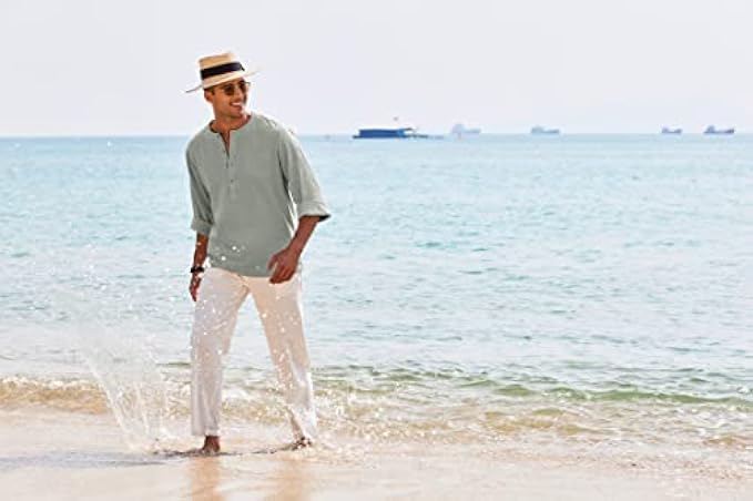 Summer Beach Linen Shirt -- The men linen yoga shirts can match with linen shorts for a relaxed summer outifts in beach vacations. Also can match with casual pants for a daily wear in home or work. Variety of wearable ways, this men henley linen shirts are a must for men's summer.