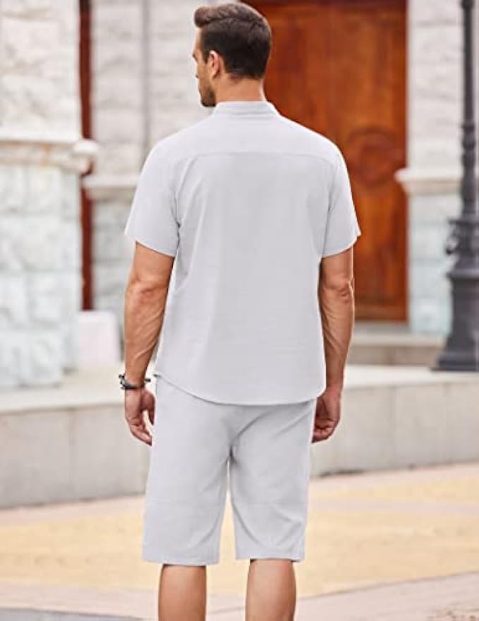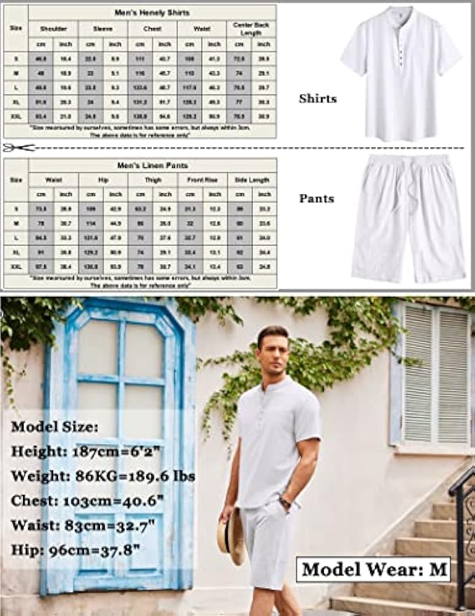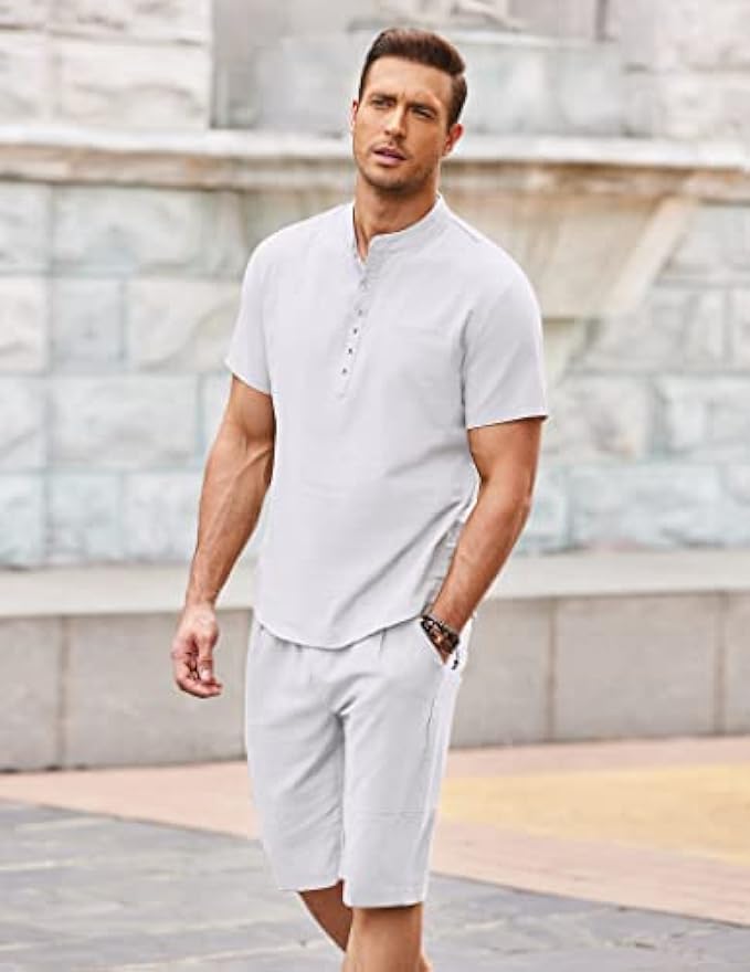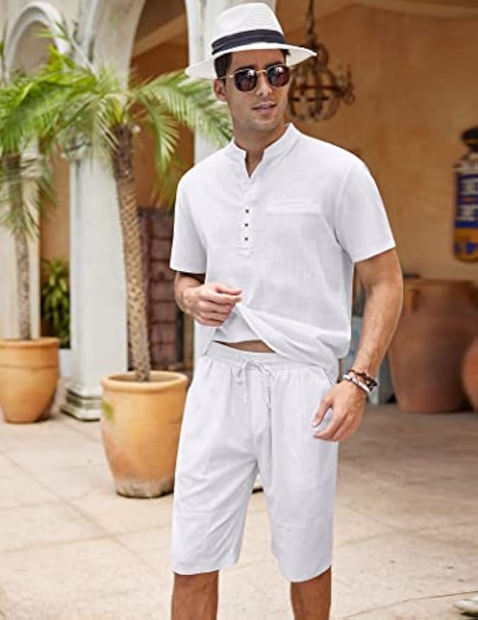 Linen and Cotton Imported Button Closure,Drawstring closure Machine Wash Mens Cotton Linen Shirts and Shorts Set: Lightweight, breathable, soft and comfortable linen shirts set, keep you cool in all day Stylish Mens Set Design: Mens henley shirts designed with stand collar, short sleeve, decoration pocket, black cross stitches, round hem,simple style, solid color, button closure; Mens elastic waist drawstring linen shorts crafted by 2 side pockets, pleated design, below knee length, hem stitching splicing. Mens Matching Shirts and Shorts: This men's linen set easy to match with a pair of sandal, canvas shoes, flip flops and so on. Beach Casual Linen Shirts Set: Suitable for daily wear, beach, streetwear, vacation, yoga, jogger, dance, school, meeting, lounge, outdoor activities, party, etc. Perfect for Spring and Summer. Garment Care: Machine Washable. Note: Please choose your size refer to the size information under the shirt and short set description before ordering.
