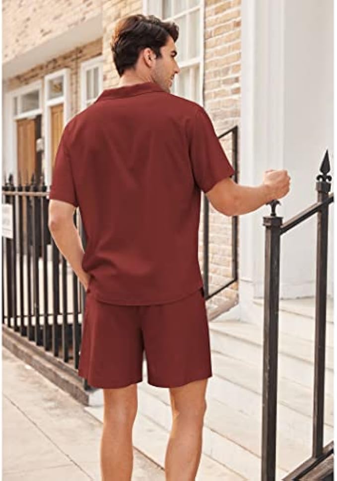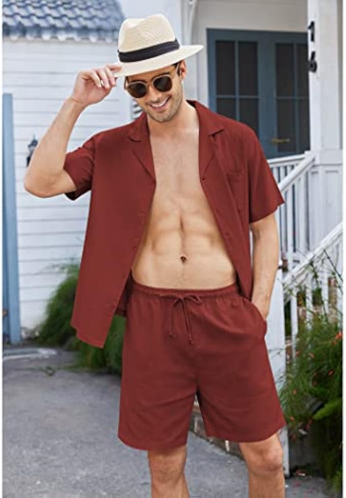 Casual Summer 0utfits --- Men beach shirts and shorts, button-down short sleeve, turn-up collar and left chest pocket. Linen beach shorts relaxed fit, with tow side deep pockets, elastic waist drawstring, simple style. Combine them together or pair them with different tops or pants for a great summer look.