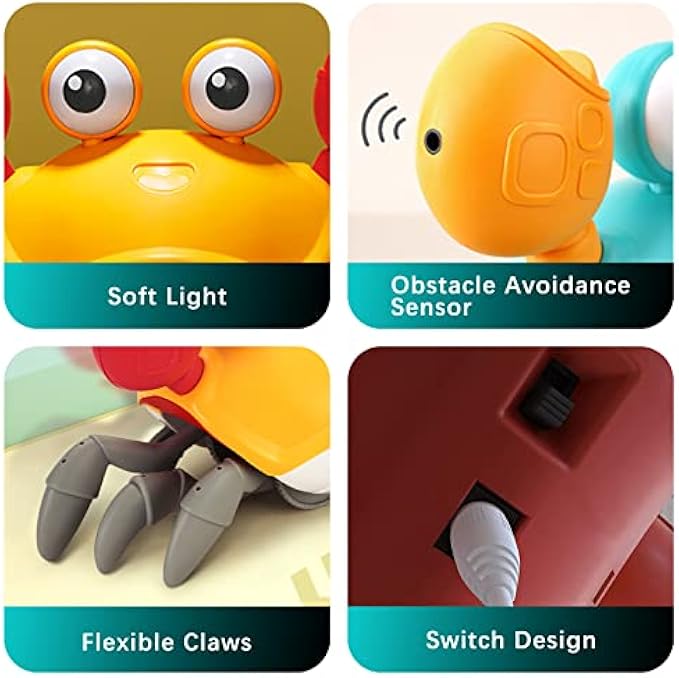 ?【Musical Crab Toy】 - Super value for LED light-up crawling &sensor obstacles avoidance function, when it encounters an obstacle during moving, it will move in the opposite direction in time. The light and music make it very attractive to kids. Note: Do not use this toy in water or humid environments.
