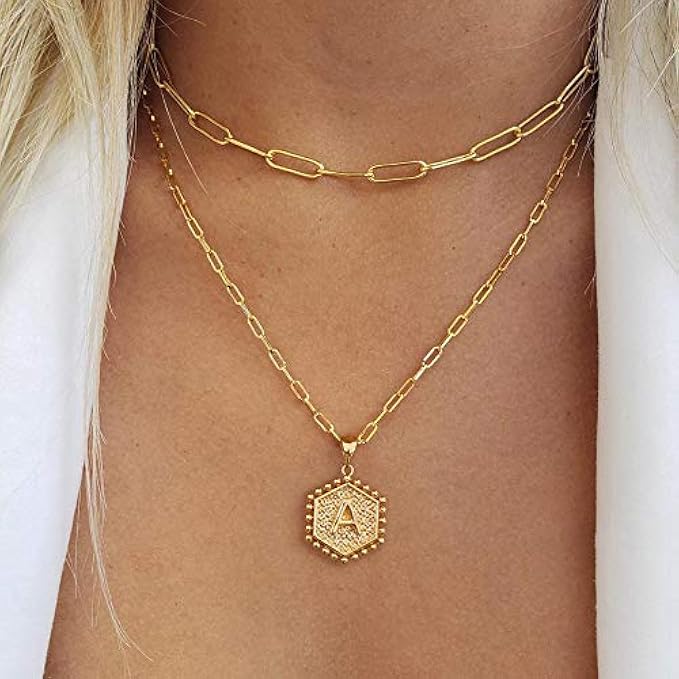 Dainty Layered Initial Necklaces for Women, 14K Gold Plated Paperclip Chain Necklace Simple Cute Hexagon Letter Pendant Initial Choker Necklace Gold Layered Necklaces for Women