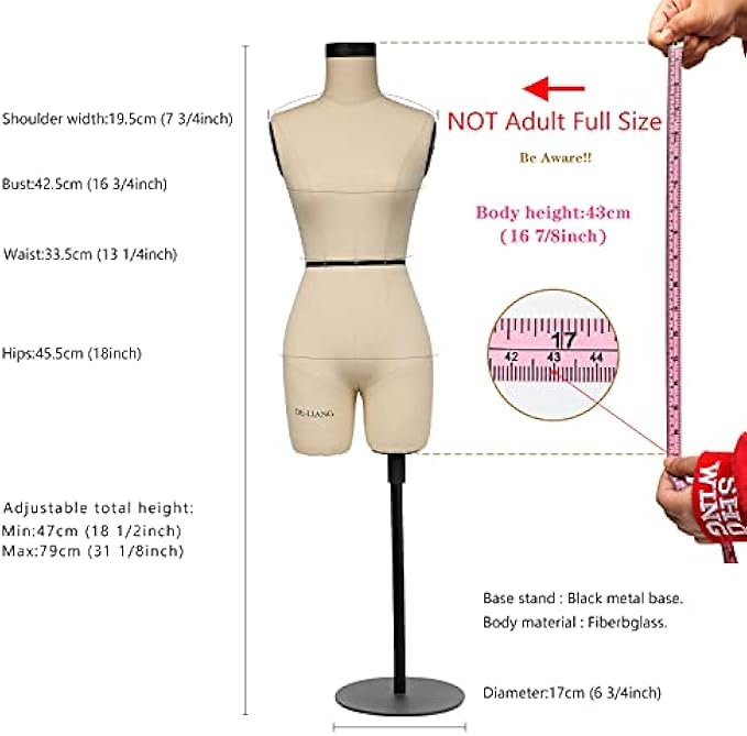 ?Size--Mannequin :Not Adult Full Size, Body Height 17" (43 cm), Shoulder to Shoulder width 7.5"(19.5 cm), Bust 16.7 "(42.5 cm), Waist 13.2"(33.5 cm), Hips 17.9"(45.5 cm), (Hand Work will have +-0.5cm Tolerance, Hope Can Be Understand). It is good for display various types of mini garments. Soft Arms: Length 30cm, Arm 13.5cm, Elbow 12cm, Wrist 9.5cm (1/2 size Soft Arms)