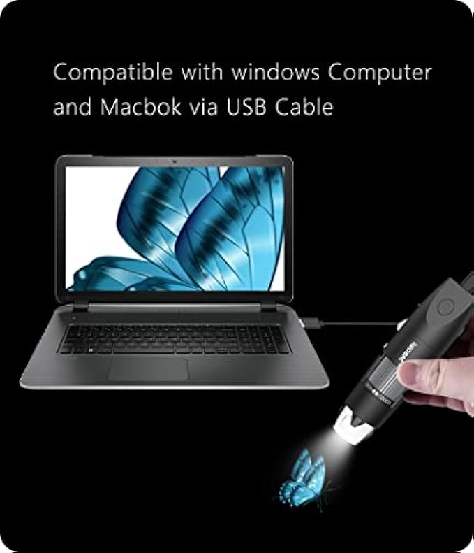 Mini Magnifier Microscope: 2 million pixels, 1080P HD picture quality for smartphone, 720P for computer, The built-in 8 Dimmable LEDs ensure the image color is clear, bright, and true. Support System: Android 6.0 or later, iOS 9.0 or later, Windows vista/7/8/10 or later, MacOS X 11.0 or later.