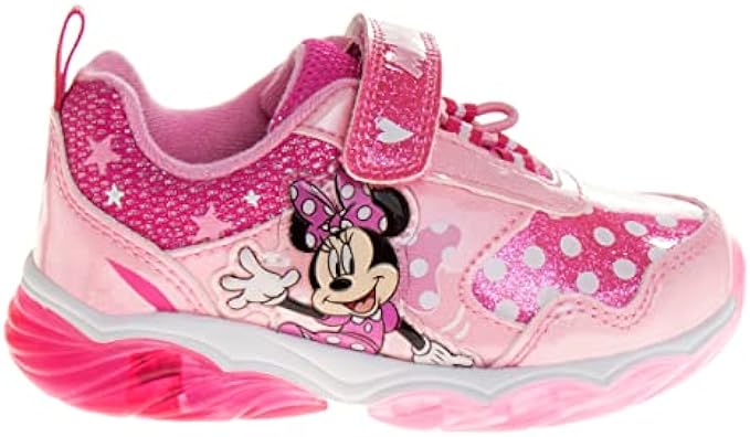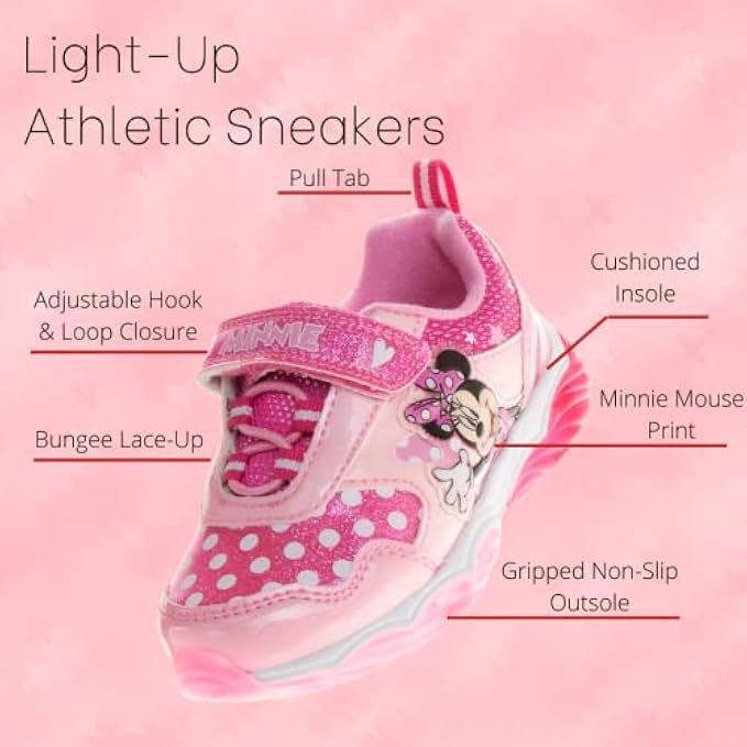 FASHIONABLE DETAILS: These cute and breathable girls' sneakers feature adorable Minnie Mouse prints and light-up LED accents; Fashionable and adorable Disney walking sneakers for toddlers and little girls makes a great gift for your daughter; Perfect gift idea for daughters, sisters, nieces, granddaughters, cousins, and friends