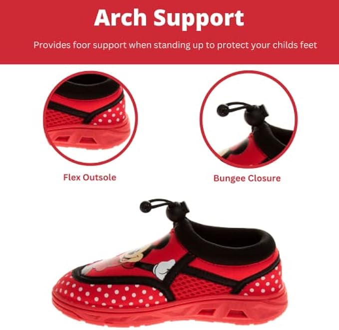 WATER SHOES FOR KIDS: Minnie Mouse toddler water shoes provide enjoyment for your child. Great for running walking or climbing. Create fun with your child's wardrobe in these cute Disney pool shoes.