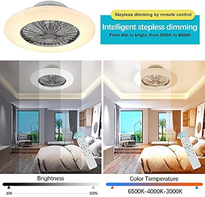 [Remote Control] All functions of our invisible blade ceiling fan can be easily controlled by remote control. The fan has 3 wind speed options (slow, medium, high) and 3 adjustable brightness (white, neutral, and warm light), which can meet your different needs. Timing function (1/2/4 hours) saves worry and energy.