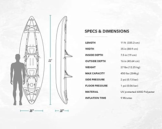 COMPACT: When deflated for transport this inflatable tandem kayak measures only 26”(L) x 16”(W) x 8”(H). It’s lightweight design makes it easy to handle by one person (27 Pounds)