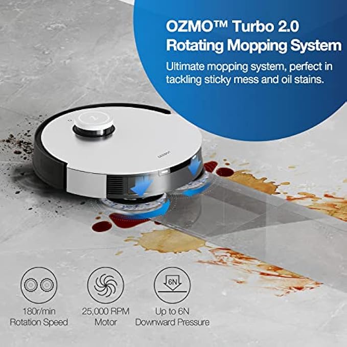 5000PA DEEP CLEANING AND ALL-NEW MOPPING. With superior 5,000PA suction power, your DEEBOT picks debris more effectively from both hard floor and carpets. The all-new OZMO Turbo rotating mopping system works doubly hard in removing stubborn stains and debris, leaving the floor clean as new.