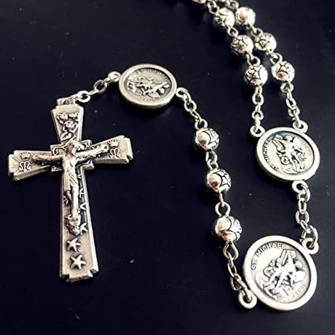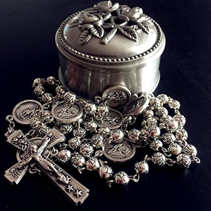 elegantmedical Handmade Silver Rose Beads Catholic Saint Michael Guardian Angel HOLY Medal Rosary Cross Necklace and Beautiful Metal Jewelry Box