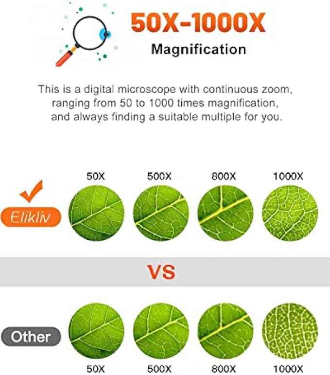 50X-1000X Magnification - This allows you to zoom in and see the incredible details of observations at a magnification range from 50X to 1000X. The actual magnification differs due to the screen size, the distance between the camera, and the observations.