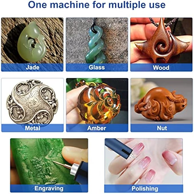 [3 Adjustable Speeds] - Our professional engraving pen has 3 speeds, which can be adjusted according to different materials, 5000-25000 rpm. Press once, 5000-10000r/min. Twice, 10000r-2000r/min. Press three times, 20000r-25000r/min. /minute. You can adjust the speed according to the material. The lowest speed allows you to do jewelry and jade artwork, and even polish nails safely, and the highest speed allows you to carve on wood glass metal.