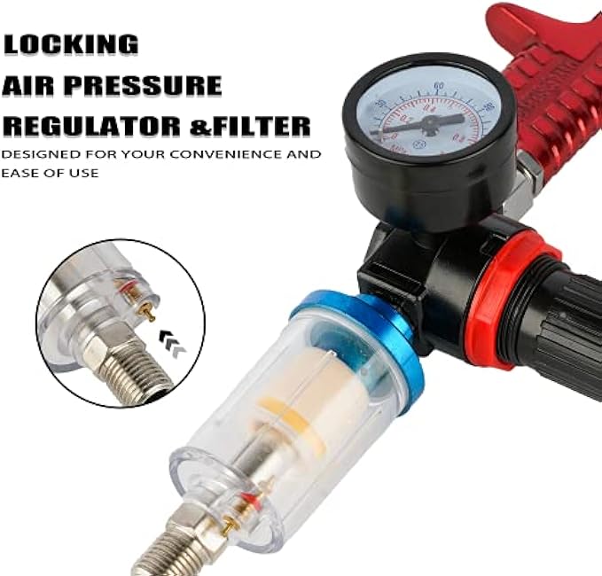 · Package Contents: 3 Spray Guns with Cups, 1 Carrying Case, 1 Locking Air Regulator with Pressure Gauge, 3 Wrenches, 2 Cleaning Brushes, 5 Extra Filters, 2 Nuts, 2 Screws.