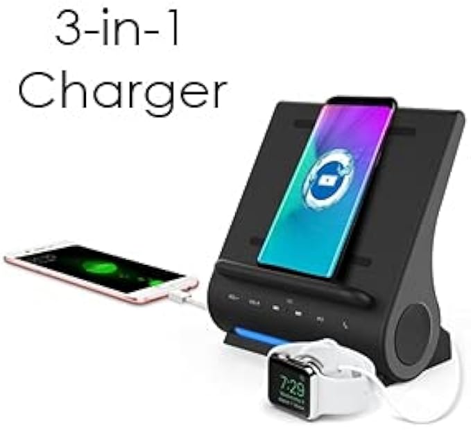 Fast 15 Watts Wireless Charger Sound Hub Bluetooth Speaker with Upgraded Mic Handsfree Calling Two USB Ports, Upright View Angle, Space Saving 4 in 1 Dock