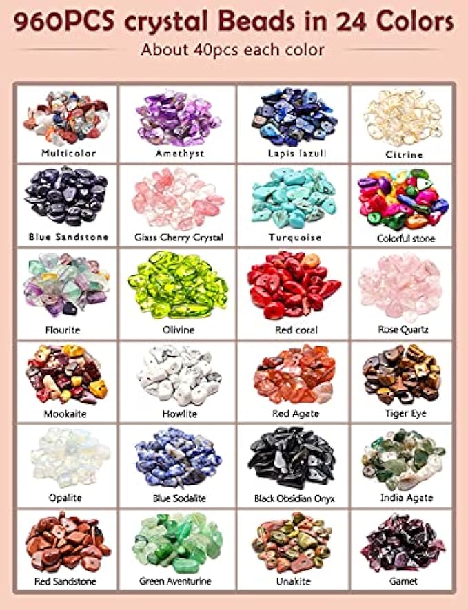 Approximately 1045 Crystal Jewelry Making Kit - This Crystal Jewelry Supplies Kit includes approximately 960 gemstone beads 0f 24 different colors packed in a 24 mesh box. This DIY jewelry making kit also comes with 5 unique silver pendants (five shapes), 30 earring hooks, 25 head pins, 25 eye pins, 25 silver split jump rings and 1 for rings, earrings, Pliers for making necklaces and bracelets.