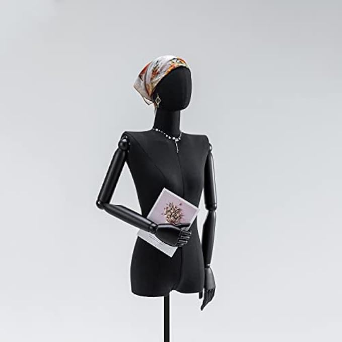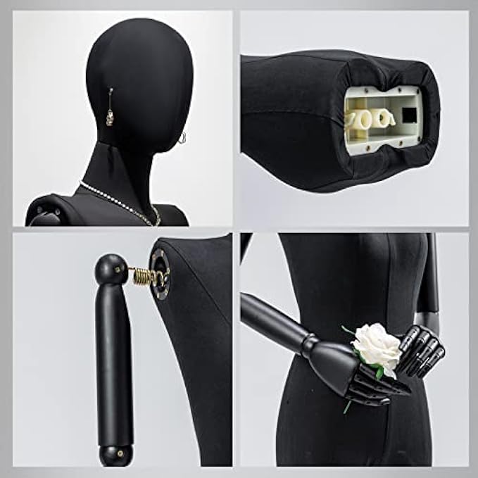 【New Upgrade】Compared with old-fashion mannequin stand, our black mannequin stand contains body, head, solid wood arm, metal bracket and rectangular base, which are all detachable and assembled. The pinnable mannequin can display your products in a window, on a counter or on the floor. The dress form ideal for sweaters, T-shirts, jackets, dresses, blouses, tops and accessories.