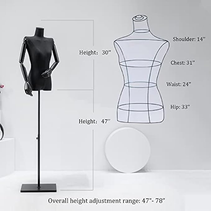 【Adjustable Height】In order to accommodate to different clothes, the height of clothing manikin can be adjusted from approx 47 inch to 78 inch by adjusting the screw on the rod to stretch the inner rod to a proper position and then fix it. The Torso Overall Height: 30 inch, Shoulders: 14 inch, Chest: 31 inch, Waist: 24 inch, Hip: 33 inch. It is perfect for various types of clothes.